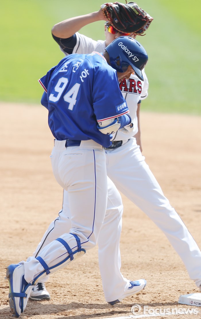 (서울=포커스뉴스) 17일 서울 잠실구장에서 열린 2016 프로야구 삼성-두산 경기 2회초 2사후 삼성 이승엽이 투수앞 땅볼을 치고 1루에서 아웃되고 있다. 이승엽은 유니폼이 세탁 도중 찢어져 조진호의 유니폼을 입고 출장했다.