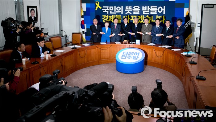 (서울=포커스뉴스) 김종인 더불어민주당 비대위 대표와 비대위원들이 18일 오전 서울 여의도 국회에서 비상대책위원회의에 앞서 취재진을 향해 포즈를 취하고 있다. 왼쪽부터 이개호, 김현미, 김영춘, 진영 비대위원, 김 대표, 이종걸 원내대표, 양승조, 정성호, 이춘석 비대위원.