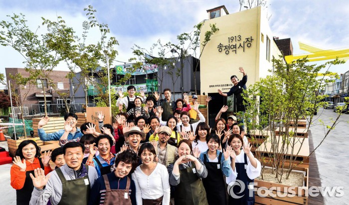 한편 현대차그룹과 광주 광역시가 함께 지난해 1월 출범시킨 광주창조경제혁신센터는 국가의 신성장 동력 확보와 지역 균형발전을 위해 자동차 벤처창업 지원과 수소경제 활성화, 중소기업 스마트팩토리 구축지원, 전통시장 활성화,낙후 지역 재생 등 다양한 사업을 진행해 성과를 내고 있다.'1913송정역시장’ 새 개장을 앞두고 시장장인, 청년상인 및 지역주민들이 모여 기념촬영을 하고 있는 모습. <사진제공=현대자동차그룹>새롭게 변모한 ‘1913송정역시장’이 연인 및 가족 손님들로 인해 북적이는 모습. <사진제공=현대자동차그룹>