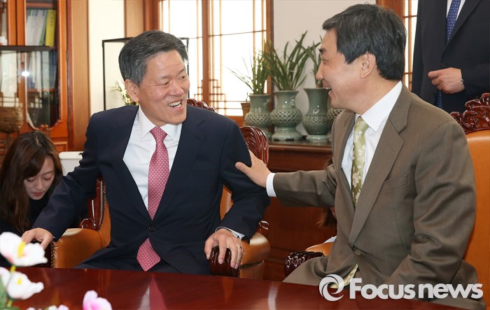 (서울=포커스뉴스) 18일 오전 서울 여의도 국회 의장실에서 열린 여야 3당 원내대표 회동에서 이종걸(오른쪽) 더불어민주당 원내대표와 주승용 국민의당 원내대표가 환한 얼굴로 인사하고 있다. 여야 지도부는 국회의장 주선으로 마련된 이 자리에서 한 달여 남은 19대 국회 의사일정과 계류 법안 처리 방안 등을 논의한다.