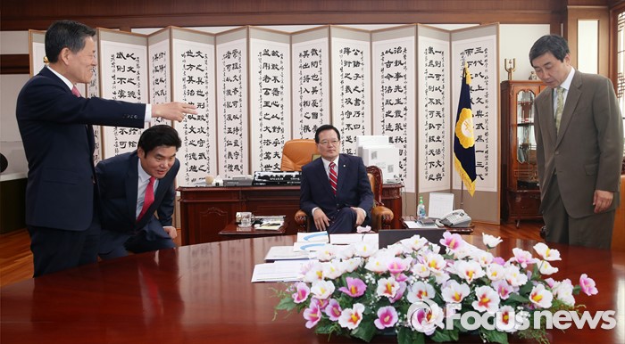 (서울=포커스뉴스) 18일 오전 서울 여의도 국회 의장실에서 열린 3당 원내대표 회동에서 정의화 국회의장과 3당 원내대표가 앉을 자리를 정하고 있다. 왼쪽부터 국민의당 주승용 원내대표, 새누리당 원유철 원내대표, 정의화 국회의장, 더불어민주당 이종걸 원내대표.