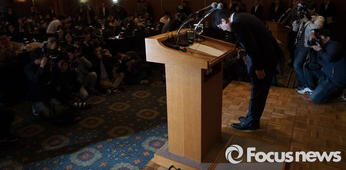 (서울=포커스뉴스) 김종인 롯데마트 대표가 18일 오전 서울 중구 롯데호텔앤리조크 서울에서 열린 가습기 살균제 사망사건 관련 기자회견에서 고개 숙여 사과를 하고 있다.