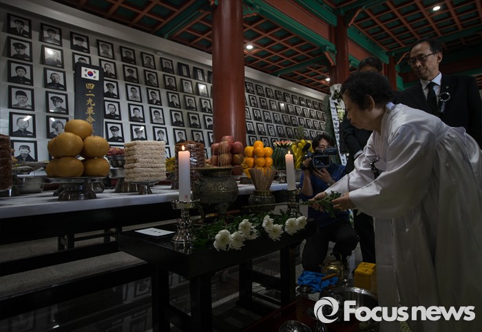 (서울=포커스뉴스) 4·19 혁명 56주기를 하루 앞둔 18일 오전 서울 강북구 국립4.19 민주묘지 유영봉안소에서 열린 4.19 혁명 희생영령 추모제를 찾은 유가족 및 관계자들이 헌화하고 있다.