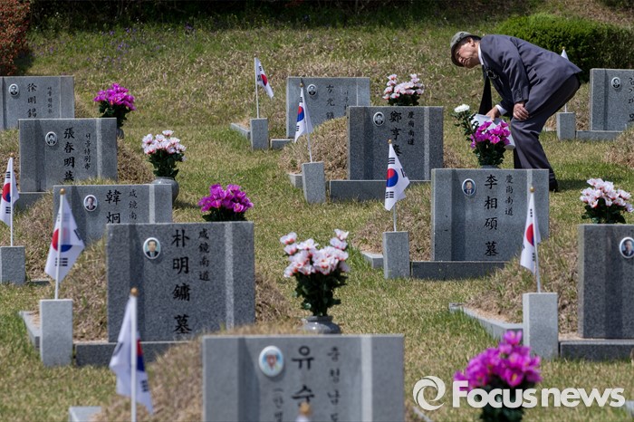 (서울=포커스뉴스) 4·19 혁명 56주기를 하루 앞둔 18일 오전 서울 강북구 국립4.19 민주묘지에서 희생자의 유가족이 묘소를 둘러보고 있다.