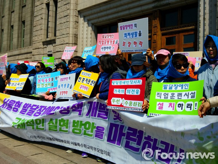 이들 단체와 발달장애인 가족들은 18일부터 4월 말까지 발달장애인 정책 수립을 촉구하는 1인 시위를 벌일 예정이다.전국장애인부모연대 서울지부와 서울특수학교학부모협의회가 18일 오전 서울 종로구 옛 서울 시청사 앞에서 기자회견을 열고 서울시 측에 발달장애인 정책 수립을 촉구했다. 장지훈 기자 jangpro@focus.co.kr전국장애인부모연대 서울지부와 서울특수학교학부모협의회가 18일 오전 서울 종로구 옛 서울시 청사 앞에서 서울시 측에 발달장애인 정책 수립을 촉구하는 기자회견을 연 뒤 시청사로 진입을 시도했지만 경찰에 의해 제지당했다. 장지훈 기자 jangpro@focus.co.kr
