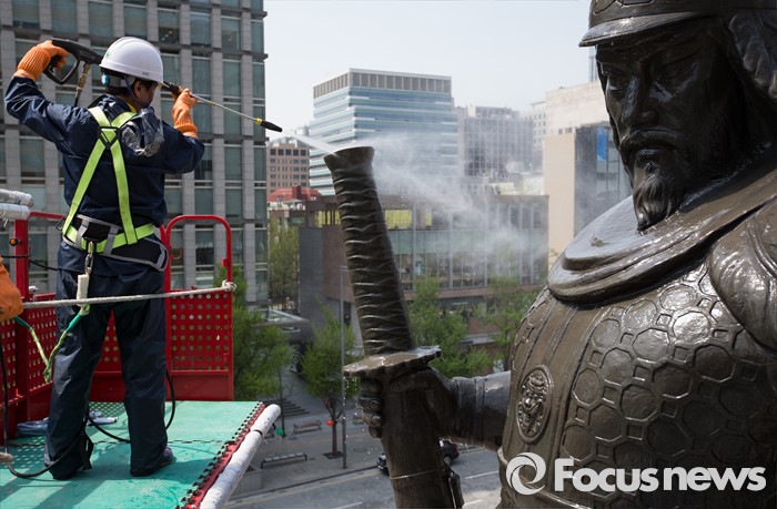 (서울=포커스뉴스) 18일 오전 서울 세종로사거리 광화문광장에서 서울시 관계자들이 이순신장군 동상 세척 및 보존 작업을 하고 있다.