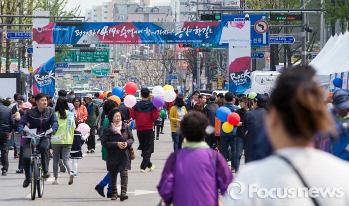 (서울=포커스뉴스) 4·19 혁명 56주기를 하루 앞둔 18일 오후 서울 강북구 광산사거리 인근에서 열린 '4.19 혁명 국민문화제 2016'에 많은 시민들이 참석하고 있다.