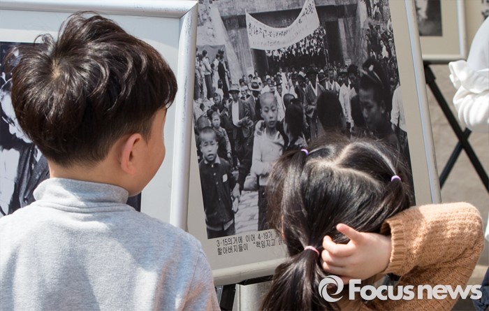 (서울=포커스뉴스) 4·19 혁명 56주기를 하루 앞둔 18일 오후 서울 강북구 광산사거리 인근에서 열린 '4.19 혁명 국민문화제 2016'에 참석한 어린이들이 혁명 당시 사진 자료들을 보고 있다.