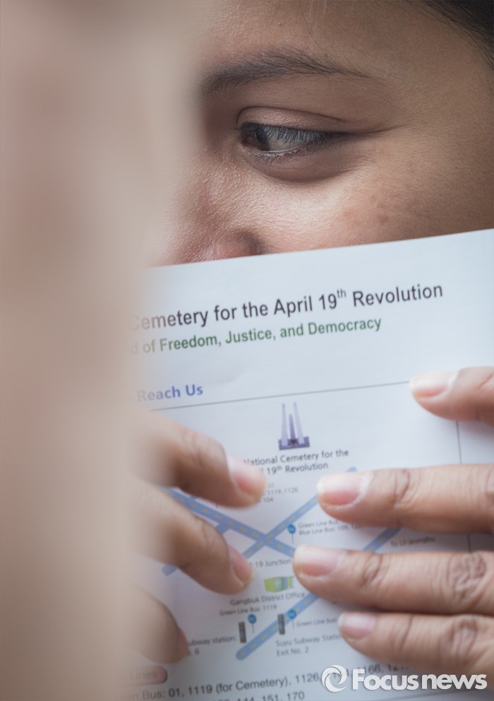 (서울=포커스뉴스) 4·19 혁명 56주기를 하루 앞둔 18일 오후 서울 강북구 국립4.19 민주묘지를 찾은 한신대학교 신학과의 필리핀 학생이 최연소 희생자인 고 임동성(당시 10세)군의 묘소를 참배 후 눈물을 훔치고 있다.