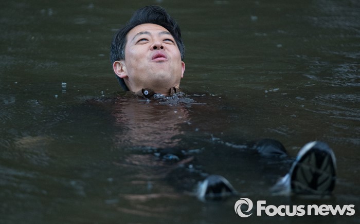 (서울=포커스뉴스) 제20대 국회의원 선거에서 당선된 김영호 더불어민주당 서대문을 당선자가 18일 오후 서울 서대문구 홍제천 폭포마당에 입수 하고 있다. 김 당선자는 서대문을 지역 투표율 60% 달성 시 홍제천 입수, 아내는 픽미댄스를 추겠다고 약속 하였다.