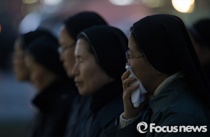 (서울=포커스튜스) 세월호 참사 2주기가 이틀 지난 18일 오후 서울 종로구 광화문광장에서 신부들과 시민들이 '세월호 희생자 기억미사'에 참석하고 있다.