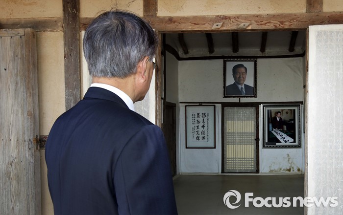 (서울=포커스뉴스) 문재인 전 더불어민주당대표가 18일전남 신안 하의도에 있는 김 전 대통령의 생가를 방문 김대중 전 대통령 사진을 보고 있다.<사진제공=문재인의원실>