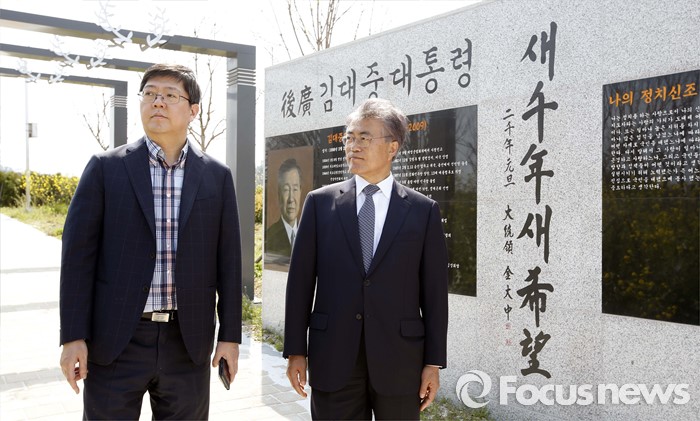 | △ DJ생가 기념비 앞의 문재인과 김홍걸 |