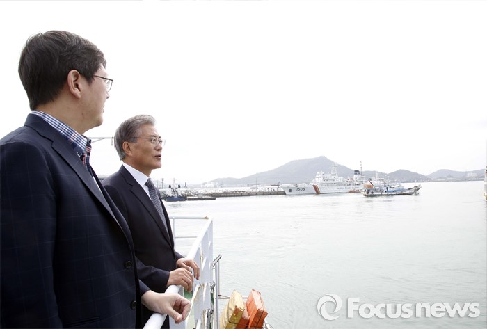 (서울=포커스뉴스) 문재인(오른쪽) 전 더불어민주당대표가 18일 김대중 전 대통령의 3남인 김홍걸 더불어민주당 국민통합위원장과 함께 전남 신안 하의도로 가고 있다.<사진제공=문재인의원실>