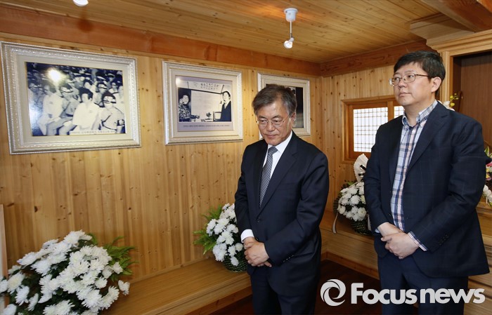 (서울=포커스뉴스) 문재인(왼쪽) 전 더불어민주당대표가 18일 김대중 전 대통령의 3남인 김홍걸 더불어민주당 국민통합위원장과 함께 전남 신안 하의도에 있는 김 전 대통령의 생가를 방문, 기념관에 전시된 사진을 관람하고 있다. <사진제공=문재인의원실>