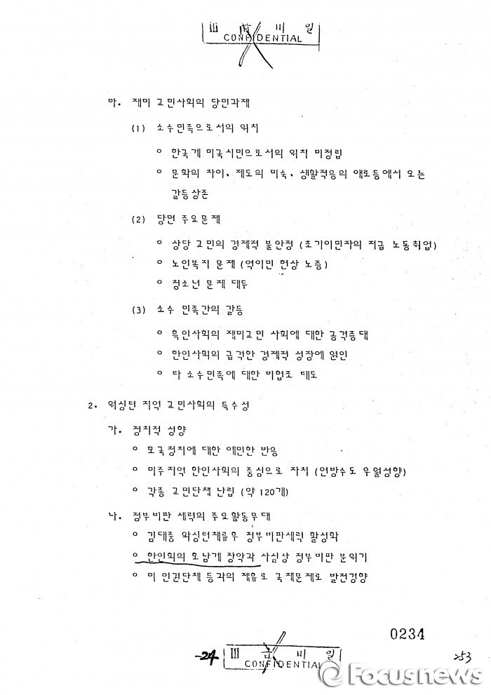 특히 당시 1981년부터 1985년까지 재직 중이던 유병현 주미대사는 1982년부터 3년째 미국에서 망명 중이던 김대중 전 대통령이 교포사회에 끼치는 영향력 등을 보고했다. 이중 호남계 동향은 1985년 5월13일 유 대사가 이원경 외무장관에게 제출한 보고서에 집중적으로 담겨있다.