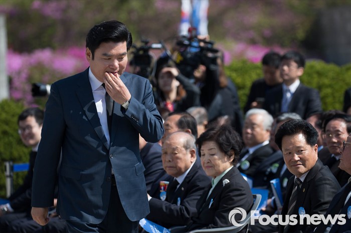 (서울=포커스뉴스) 19일 오전 서울 강북구 국립 4.19 민주묘지에서 열린 '제56주년 4.19혁명 기념식'에 참석한 원유철 새누리당 원내대표가 자리로 들어서고 있다.