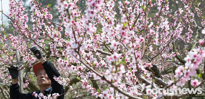 (세종=포커스뉴스) 화창한 봄 날씨를 보인 19일 오전 세종시 연서면 복숭아밭에서 농민이 복사꽃을 속아내고 있다.