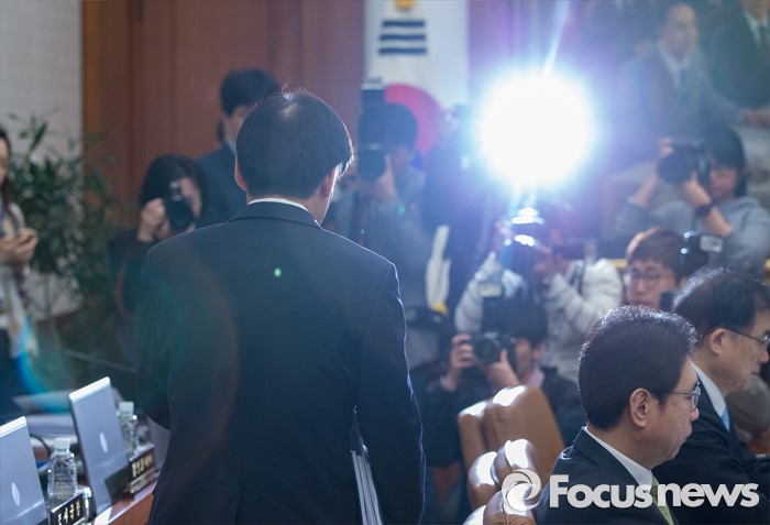 ▲ 이 그래프는 전년 동기 대비로 그린 것이라 작년 상하반기에 따른 기저효과가 있다. 전기비로는 상반기보다 하반기가 더 개선됐다.(서울=포커스뉴스) 이주열 한국은행 총재가 19일 오전 서울 중구 남대문로 한국은행 본관에서 열린 금융통화위원회의에 참석하고 있다. 2016.04.19 양지웅 기자