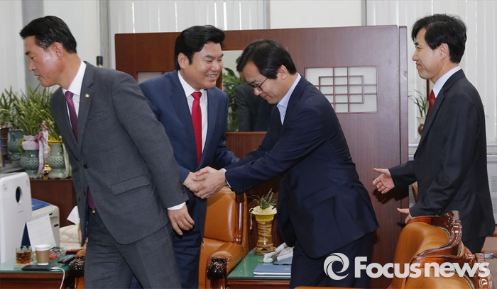 (서울=포커스뉴스) 원유철 새누리당 원내대표가 19일 오후 서울 여의도 국회에서 원 원내대표의 비상대책위원회 체제에 반대 입장을 가진 의원 및 당선인으로 구성된 당 혁신모임(가칭) 소속 의원들과 면담에 앞서 인사하고 있다. 왼쪽부터 황영철 의원, 원 원내대표, 김영우, 하태경 의원.