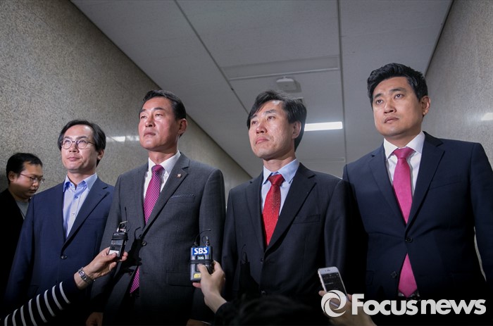 (서울=포커스뉴스) 원유철 새누리당 원내대표의 비상대책위원회 체제에 반대 입장을 가진 의원 및 당선인으로 구성된 당 혁신모임(가칭) 소속 오신환(오른쪽부터), 하태경, 황영철, 김영우 의원이 19일 오후 서울 여의도 국회에서 면담을 위해 원 원내대표 집무실로 향하고 있다.