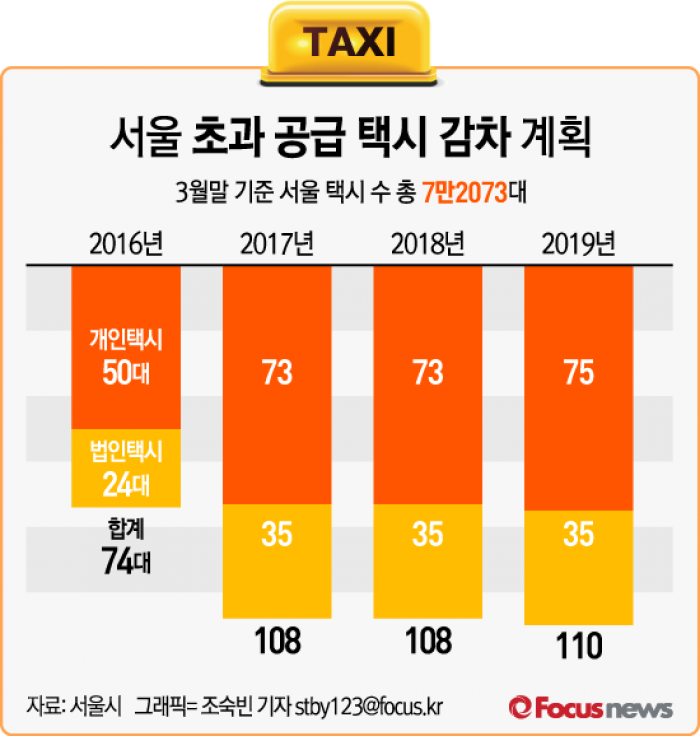 (서울=포커스뉴스) 서울시는 지난 12일 개최된 제5차 택시감차위원회에서 1만1831대의 초과 공급된 택시를 줄이는데 동의하고 앞으로 20년간 택시를 줄여나가기로 했다고 19일 밝혔다.