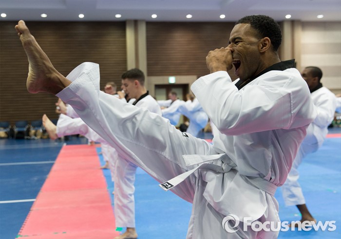 (서울=포커스뉴스) 19일 오후 서울 용산구 국방부 다목적홀에서 한국문화 체험행사에 참가한 주한미군 장병들이 태권도를 배우고 있다.