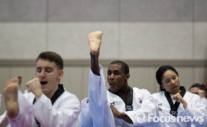 (서울=포커스뉴스) 19일 오후 서울 용산구 국방부 다목적홀에서 한국문화 체험행사에 참가한 주한미군 장병들이 태권도를 배우고 있다.