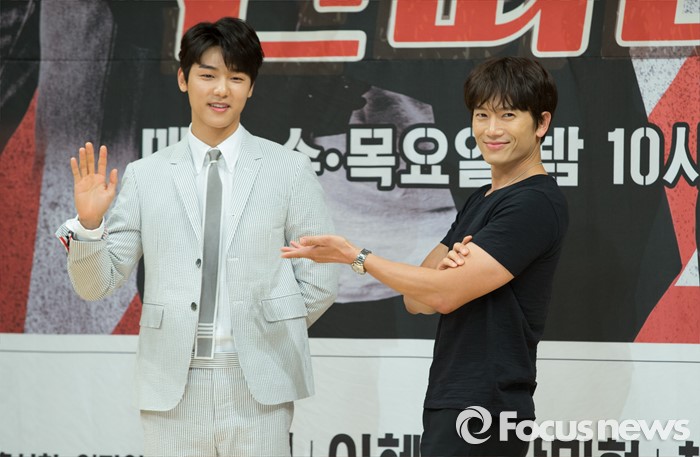 (서울=포커스뉴스) 19일 오후 서울 SBS 목동사옥에서 열린 SBS 드라마 스페셜 '딴따라' 제작발표회에 참석한 배우 강민혁(왼쪽)과 지성이 포토타임을 갖고 있다.