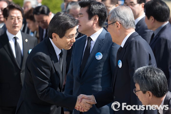 한편, 박근혜 대통령은 이날 오전 8시에 먼저 국립4·19민주묘지를 들려 참배를 한 것으로 알려졌다.19일 오전 서울 강북구 국립 4.19 민주묘지에서 열린 '제56주년 4.19혁명 기념식'에서 황교안(왼쪽) 국무총리가 김종인 더불어민주당 비대위 대표와 악수하고 있다. 2016.04.19 이승배 기자