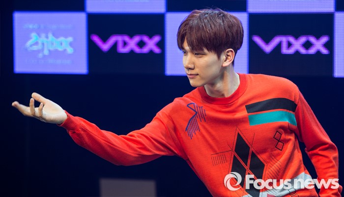 홀서울=포커스뉴스) 19일 오후 서울 마포구 롯데카드 아트센터에서 열린 아이돌그룹 VIXX의 싱글앨범 'Zelos' 발표 쇼케이스에 참여한 멤버 혁이 포토타임을 갖고 있다.
