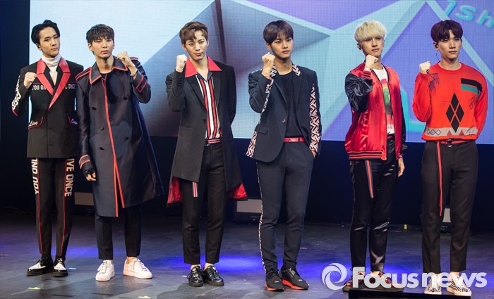 홀서울=포커스뉴스) 19일 오후 서울 마포구 롯데카드 아트센터에서 열린 아이돌그룹 VIXX의 싱글앨범 'Zelos' 발표 쇼케이스에 참여한 멤버들이 포토타임을 갖고 있다. 왼쪽부터 라비, 레오,홍빈, 엔, 켄, 혁.