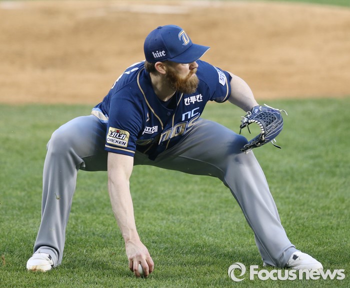 (서울=포커스뉴스) 19일 서울 잠실구장에서 열린 2016 프로야구 NC-LG 경기 2회말 무사 1,2루에서 NC 투수 해커가 LG 정성훈의 희생번트 타구를 잡으며 1루를 바라보고 있다.