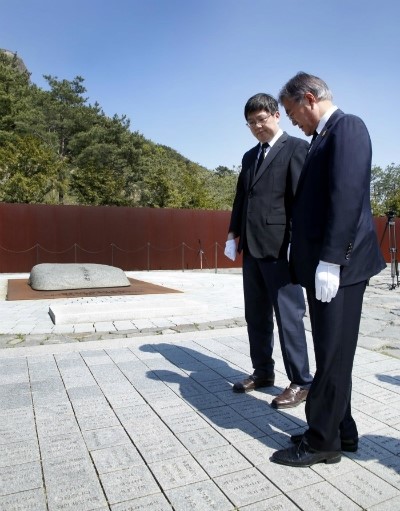| △ 노 전 대통령 묘역 주변 둘러보는 문재인-김홍걸 |