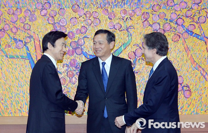 (서울=포커스뉴스) 윤병세 외교부 장관이 19일 오후 서울 종로구 외교부에서 사이키 아키타카 일본 외무성 사무차관, 토니 블링컨 미국 국무부 부장관과 접견에 앞서 악수 하고 있다.