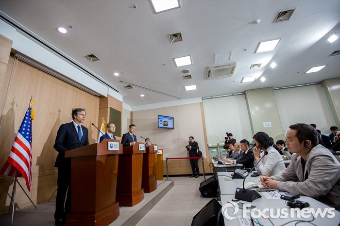 (서울=포커스뉴스) 토니 블링컨 미국 국무부 부장관이 19일 오후 서울 종로구 외교부에서 '제3차 한미일 외교차관 협의회' 결과 발표를 하고 있다.