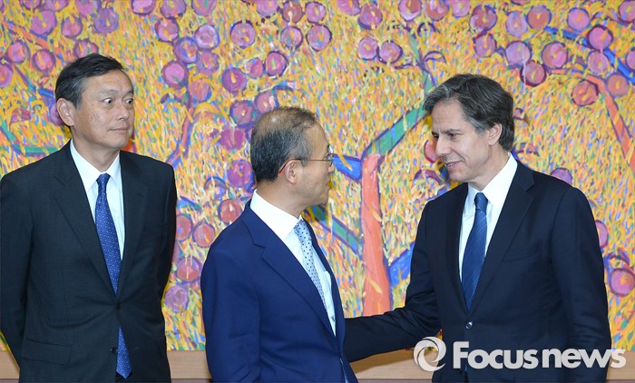 (서울=포커스뉴스) 한미일 외교차관이 19일 오후 서울 종로구 외교부에서 윤병세 외교부 장관과 접견에 앞서 대화를 나누고 있다. 왼쪽부터 사이키 아키타카 일본 외무성 사무차관, 임성남 외교부 제1차관, 토니 블링컨 미국 국무부 부장관.