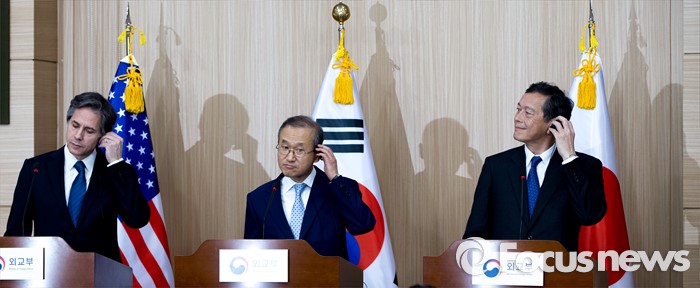 (서울=포커스뉴스) 한미일 외교차관이 19일 오후 서울 종로구 외교부 브리핑실에서 '제3차 한미일 외교차관 협의회' 결과 발표를 마친 뒤 취재진 질문을 듣고 있다. 왼쪽부터 토니 블링컨 미국 국무부 부장관, 임성남 외교부 제1차관, 사이키 아키타카 일본 외무성 사무차관.