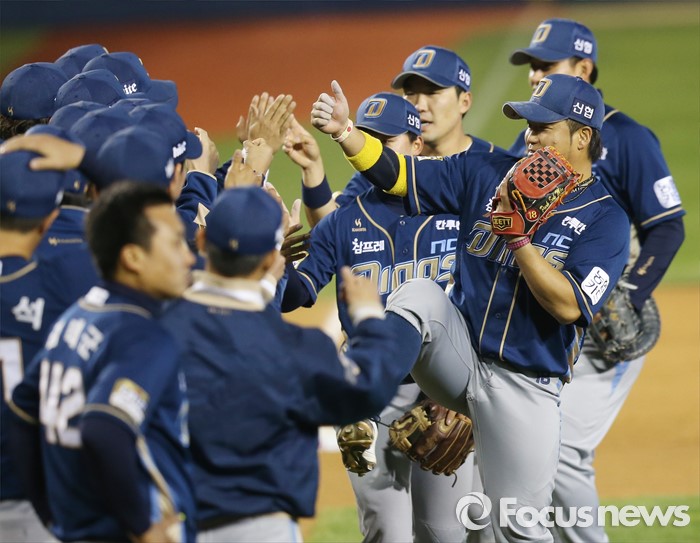 (서울=포커스뉴스) 19일 서울 잠실구장에서 열린 2016 프로야구 NC-LG 경기에서 LG에 승리한 NC 선수들이하이파이브하며 기뻐하고 있다.