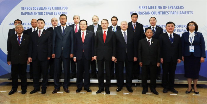 (서울=포커스뉴스) 정의화(앞줄 왼쪽 네번째) 국회의장이 19일 오전(현지시각) 러시아 모스크바 래디슨 로얄 호텔에서 1차 유라시아 국회의장 회의에 앞서 참석자들과 기념촬영을 하고 있다. <사진제공=국회>