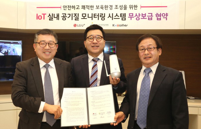 20일 LG유플러스에 따르면 어린이집안전공제회가 선정한 전국 어린이집 55곳에 케이웨더의 사물인터넷(IoT)기반 실내 공기 모니터링 장비 '에어가드K LTE'를 설치하고 향후 3년간 통신료를 무상 지원하기로 했다. 에어가드K LTE는 자체 탑재된 환경 관측센서를 통해 실내 미세먼지, 온도 및 습도, 이산화탄소, 휘발성유기화합물(VOCs), 소음 등 6가지 실내환경 요소를 측정하는 IoT 장비다.