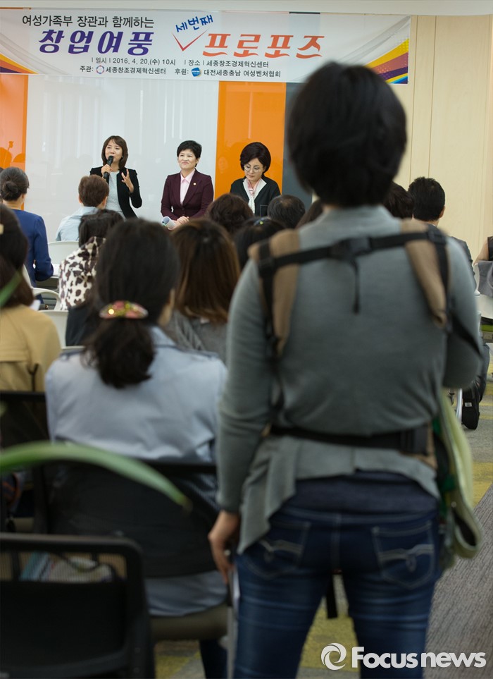 (세종=포커스뉴스) 20일 오전 세종시 조치원읍 세종창조경제혁신센터에서 열린 창업여풍 세 번째 프로포즈 여성가족부장관과 함께하는 토크콘서트에서 참석자가 아이를 안고 토크콘서트를 바라보고 있다.