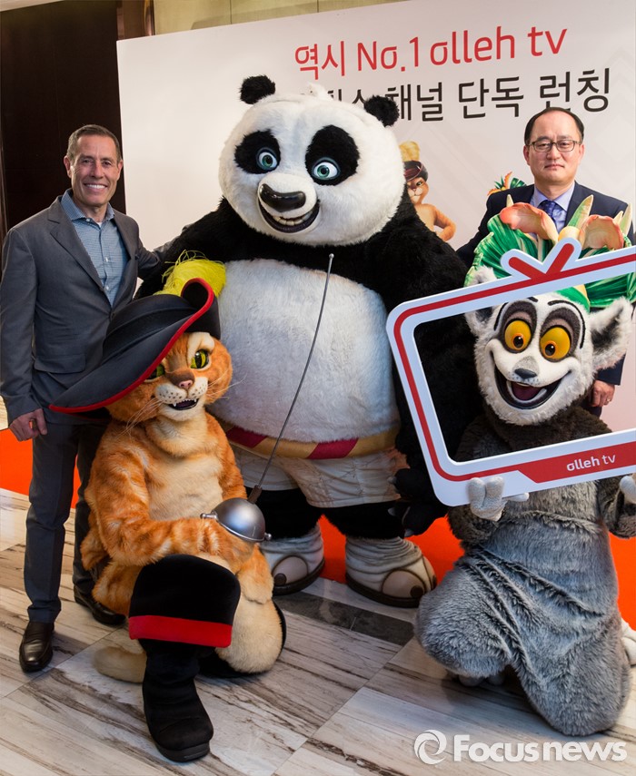 (서울=포커스뉴스) 20일 오전 서울 중구 그랜드 앰버서더 호텔에서 열린 '올레tv 드림웍스 채널 출시' 기자간담회에 참석한 에릭 엘렌보겐(왼쪽) 드림웍스 해외TV사업 대표와 강국현 KT 마케팅본부장이 드림웍스 매니메이션 캐릭터 인형옷을 입은 모델들과 함께 포즈를 취하고 있다.
