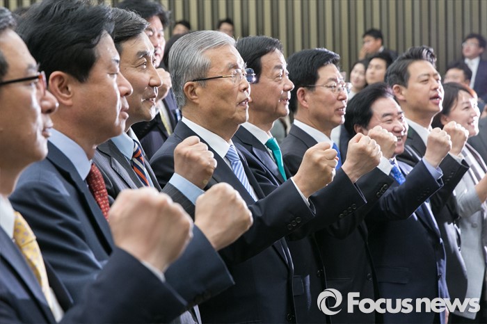 (서울=포커스뉴스) 김종인(왼쪽 네번째) 더불어민주당 비상대책위 대표와 이종걸(왼쪽 세번째) 원내대표를 비롯한 제20대 국회의원 선거 당선자들이 20일 오전 서울 여의도 국회에서 열린 제20대 국회 당전자 대회에 참석해, 화이팅을 외치고 있다.