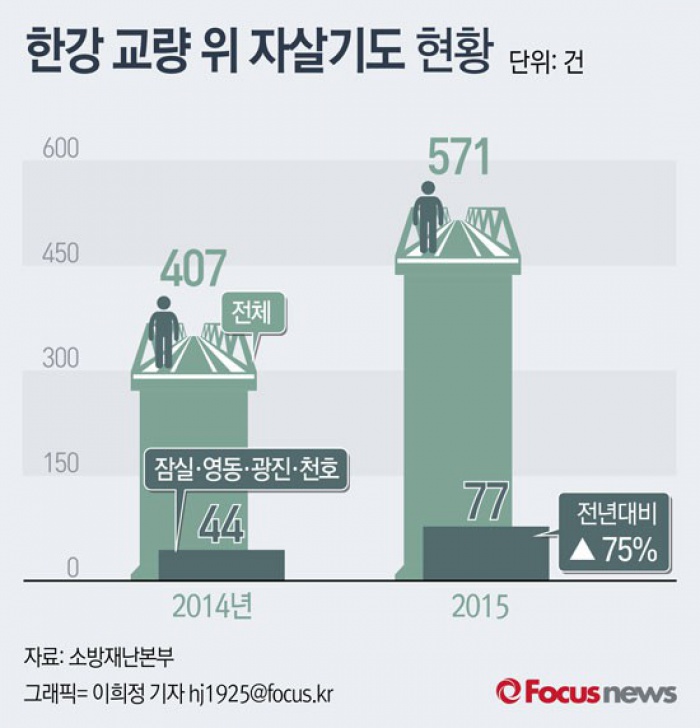 (서울=포커스뉴스) 광진경찰서가 밝힌 소방재난본부 자료에 따르면 2015년 한강다리에서 발생한 자살기도 사건은 모두 571건으로 이 중 잠실대교, 영동대교, 광진교, 천호대교 등 4대 다리에서 77건이 발생했다.