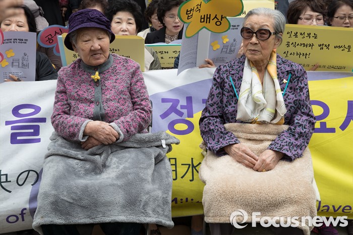 (서울=포커스뉴스) 20일 오후 서울 종로구 옛 주한일본대사관 앞에서 피해 할머니들을 비롯한 한국정신대문제대책협의회와 참석자들이 '제1227차 일본군 위안부 문제해결을 위한 정기 수요시위'를 하고 있다.