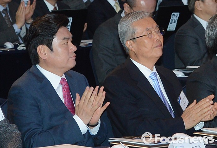 (서울=포커스뉴스) 원유철(왼쪽) 새누리당 원내대표와 김종인 더불어민주당 비대위 대표가 20일 오전 서울 중구 을지로 롯데호텔에서 열린 2016 한국포럼에 참석해 박수치고 있다.