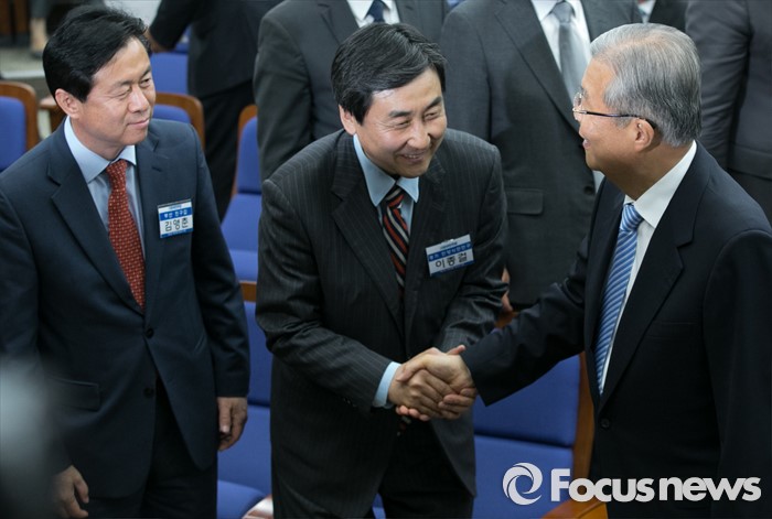 (서울=포커스뉴스) 20일 오전 서울 여의도 국회에서 열린 더불어민주당 20대 총선 당선자 대회에 참석한 김종인(오른쪽) 비대위 대표와 이종걸(가운데) 원내대표가 악수하고 있다. 왼쪽은 김영춘 당선인.