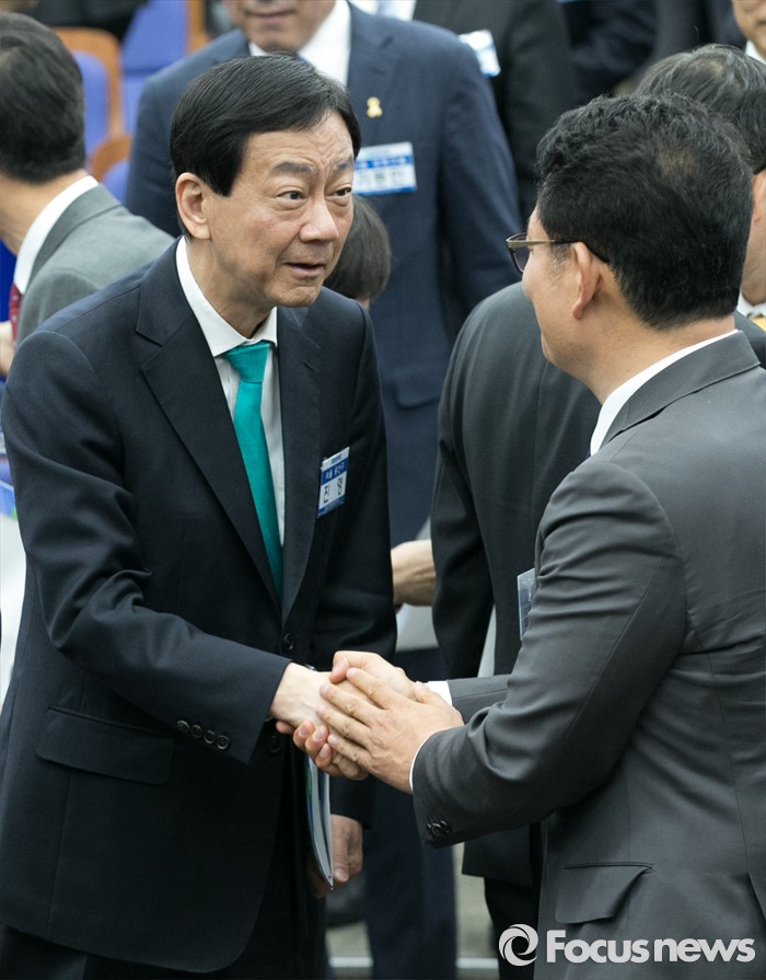 (서울=포커스뉴스) 20일 오전 서울 여의도 국회에서 열린 더불어민주당 20대 총선 당선자 대회에 참석한 진영(왼쪽), 송영길 당선인이 인사하고 있다.