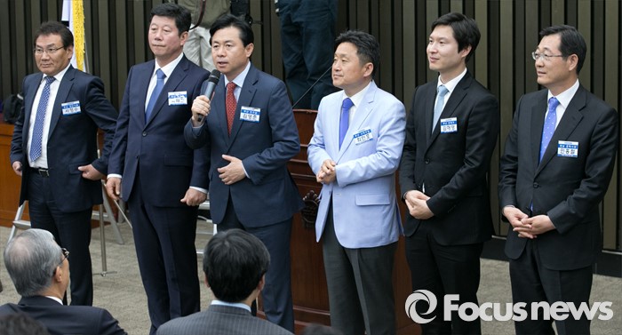 (서울=포커스뉴스) 20일 오전 서울 여의도 국회에서 열린 더불어민주당 20대 총선 당선자 대회에 부산 및 경남 지역에서 당선한 서형수(왼쪽부터), 박재호, 김영춘, 최인호, 김해영, 민홍철 당선인이 인사말을 하고 있다.